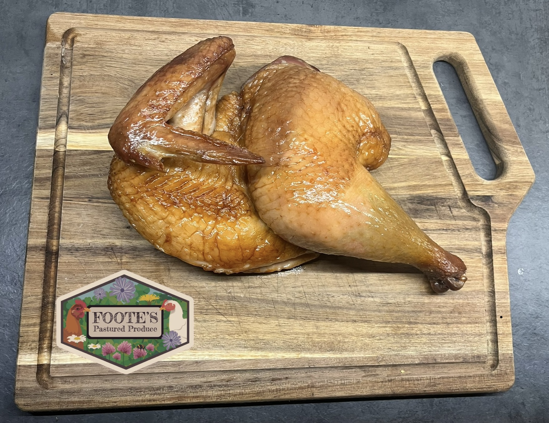 Footes Pastured Produce Cornish pasture raised chicken are seasonally reared at a slow pace. our chickens move every day to fresh diverse pastures. Feasting on herbs, grasses and insects gives them a diet that enhances the flavour and texture. We manage our birds in a way that promotes diversity in our pastures, the daily move means our chickens don’t over pressure our resources, allowing for fast recovery and adding vital fertility back to the land.